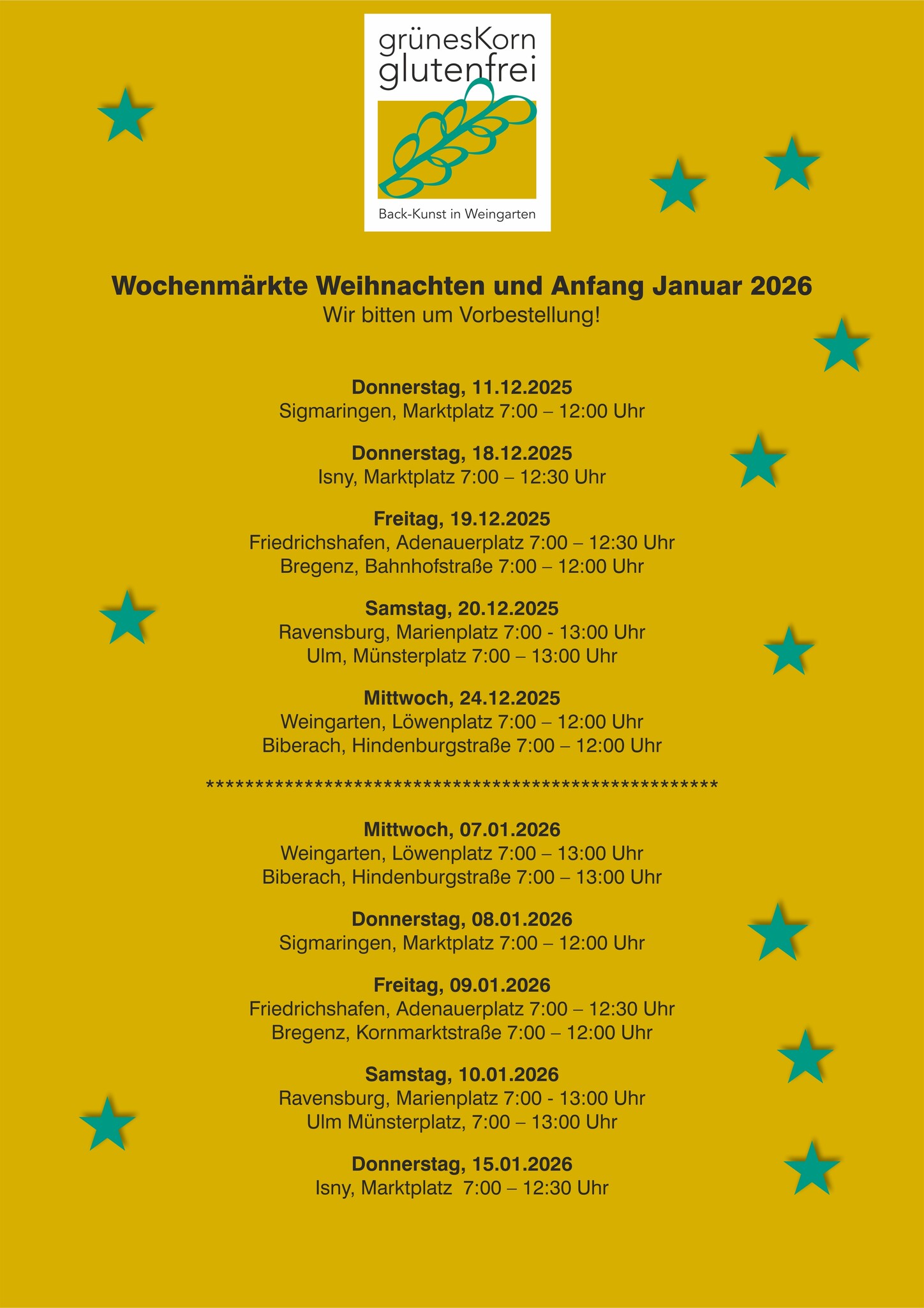 Bestellungen für den Wochenmarkt können bis zu einem Tag vorher (bis 12.00 Uhr) telefonisch oder per E-Mail aufgegeben werden.